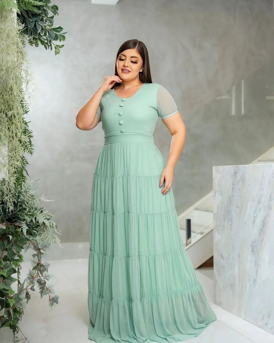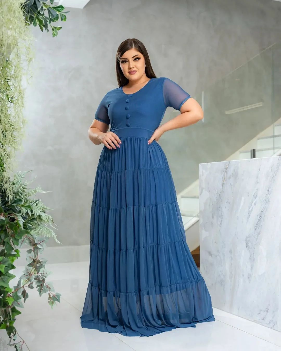 Vestido Longo Feminino Forrado Tule Slim Plus Size